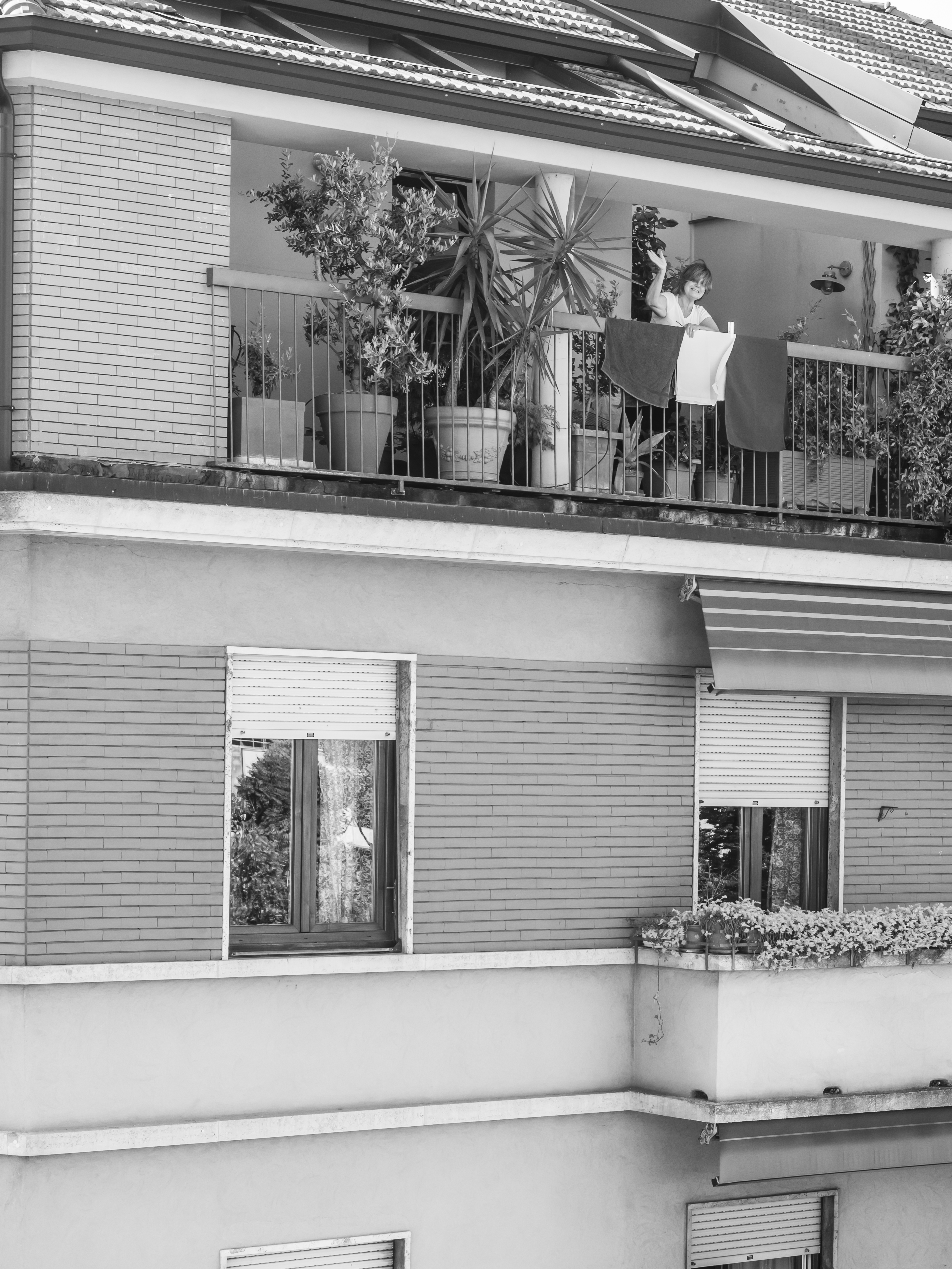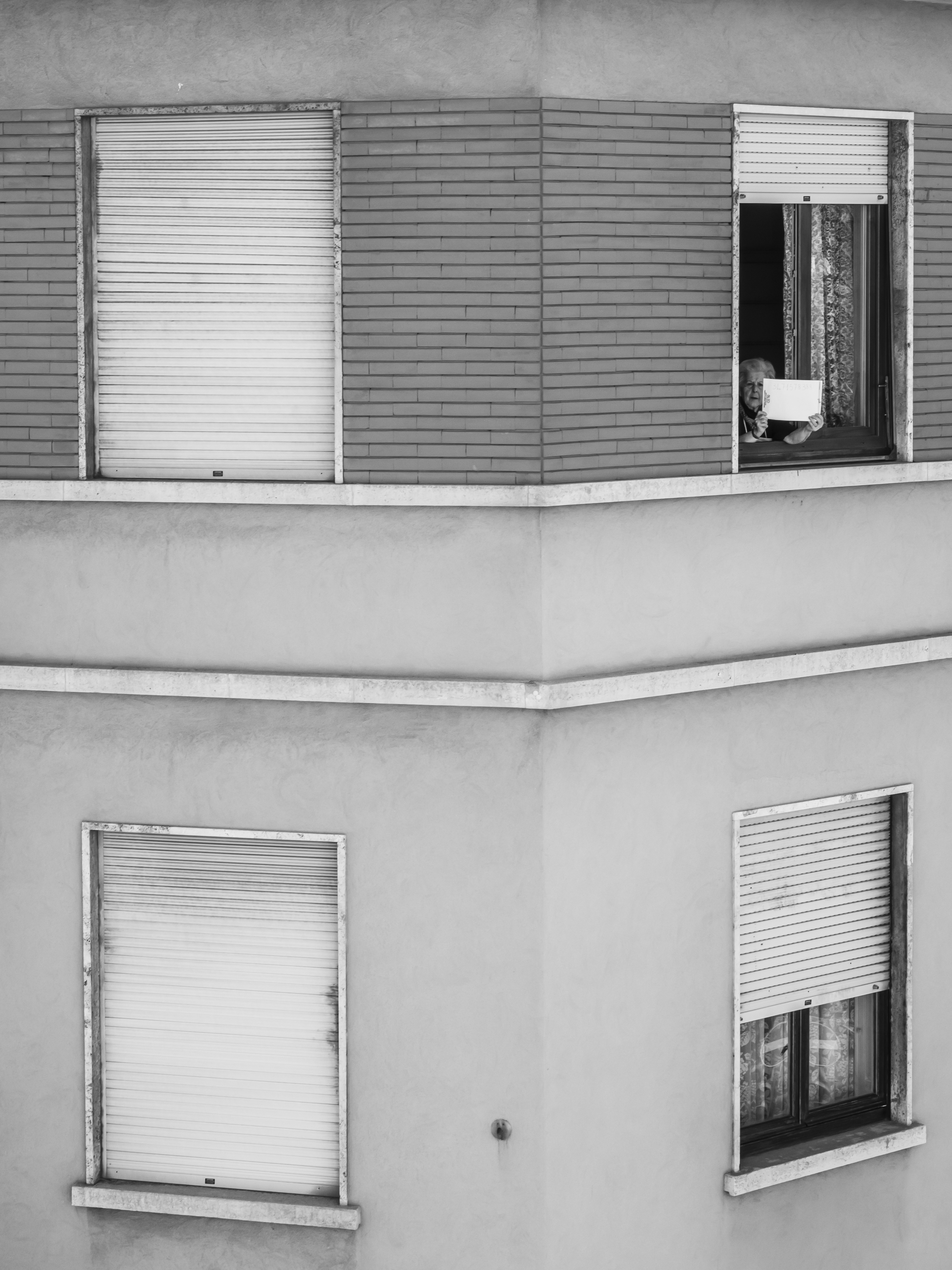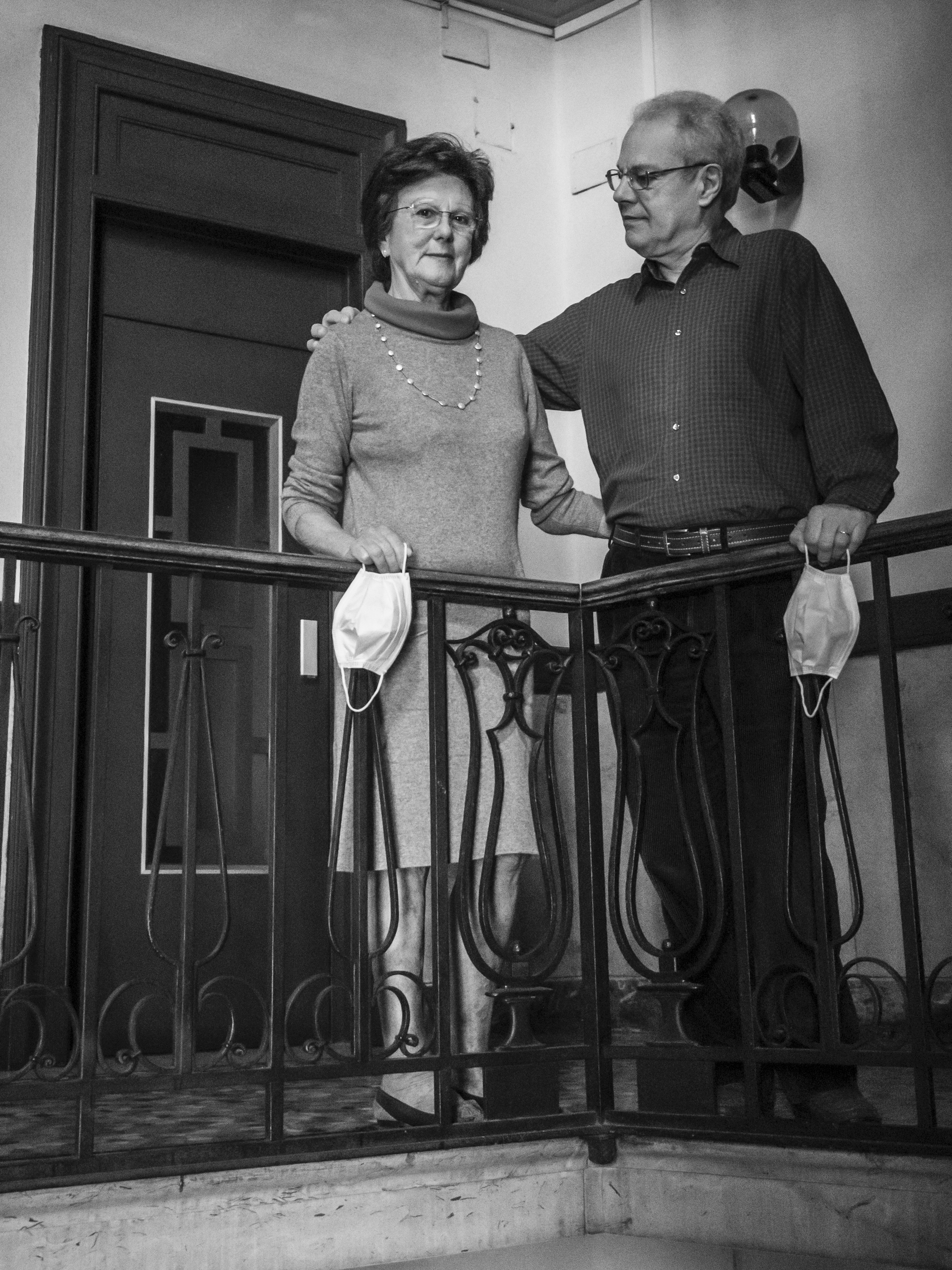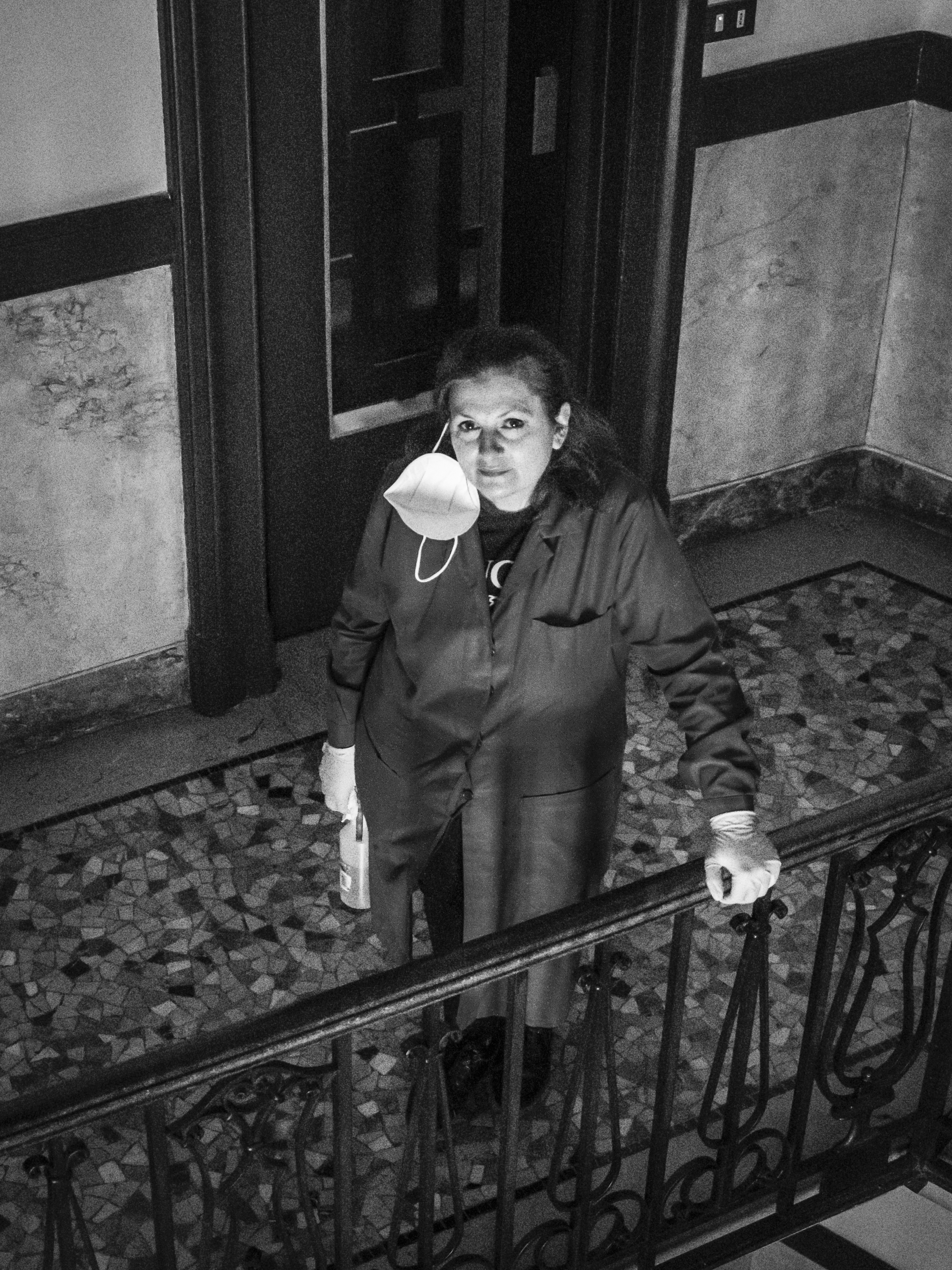 Osservo queste persone, sconosciute fino a ieri e ora, all’improvviso, una compagnia preziosa nei miei lunghi giorni di isolamento. È negli spazi comuni in cui ci incontriamo — scale e balconi — che compongo il mio diario per immagini. Scatto in bianco e nero perché l’assenza di colore accentua il ricordo di questa esperienza unica di “isolamento collettivo”.