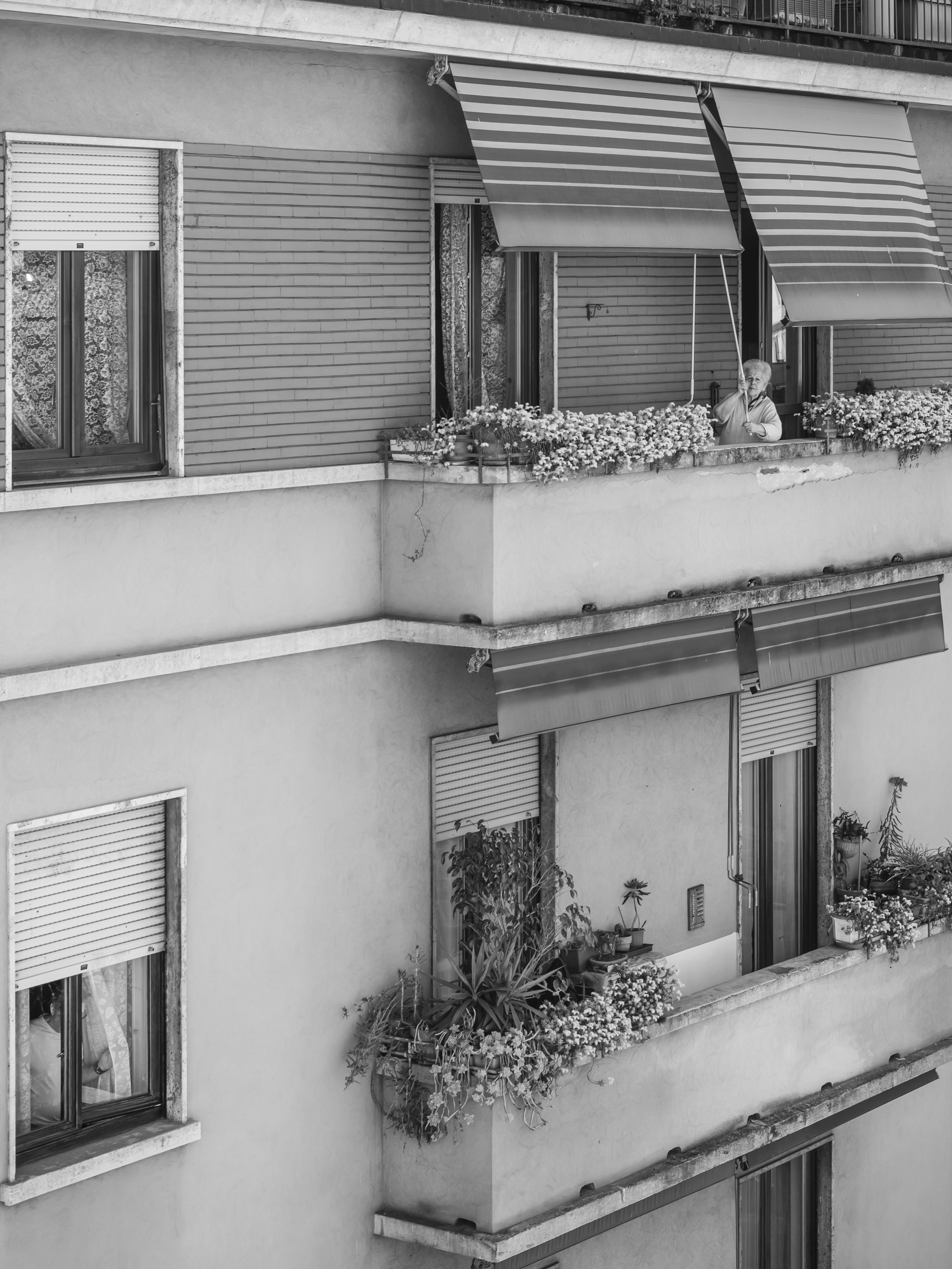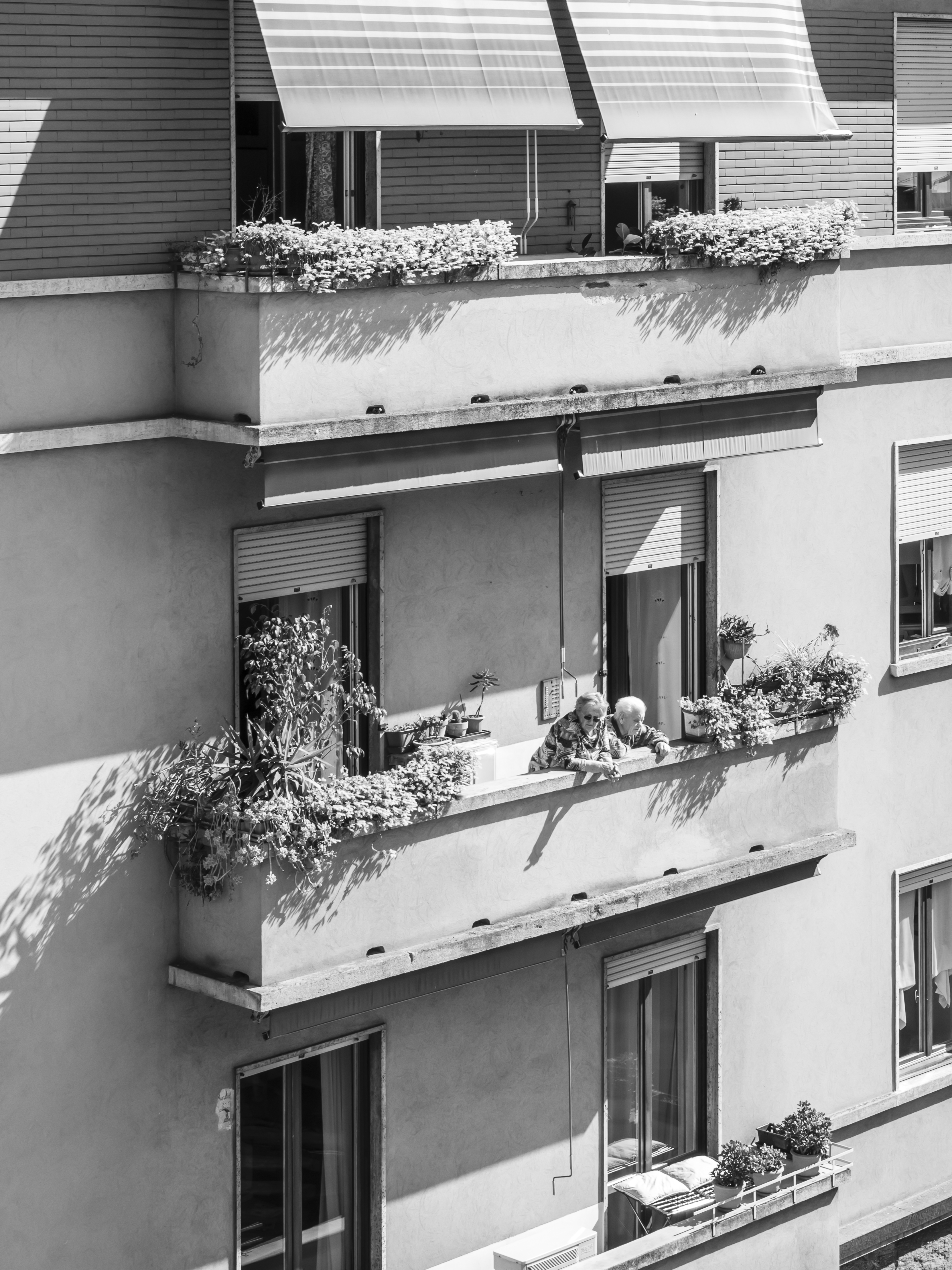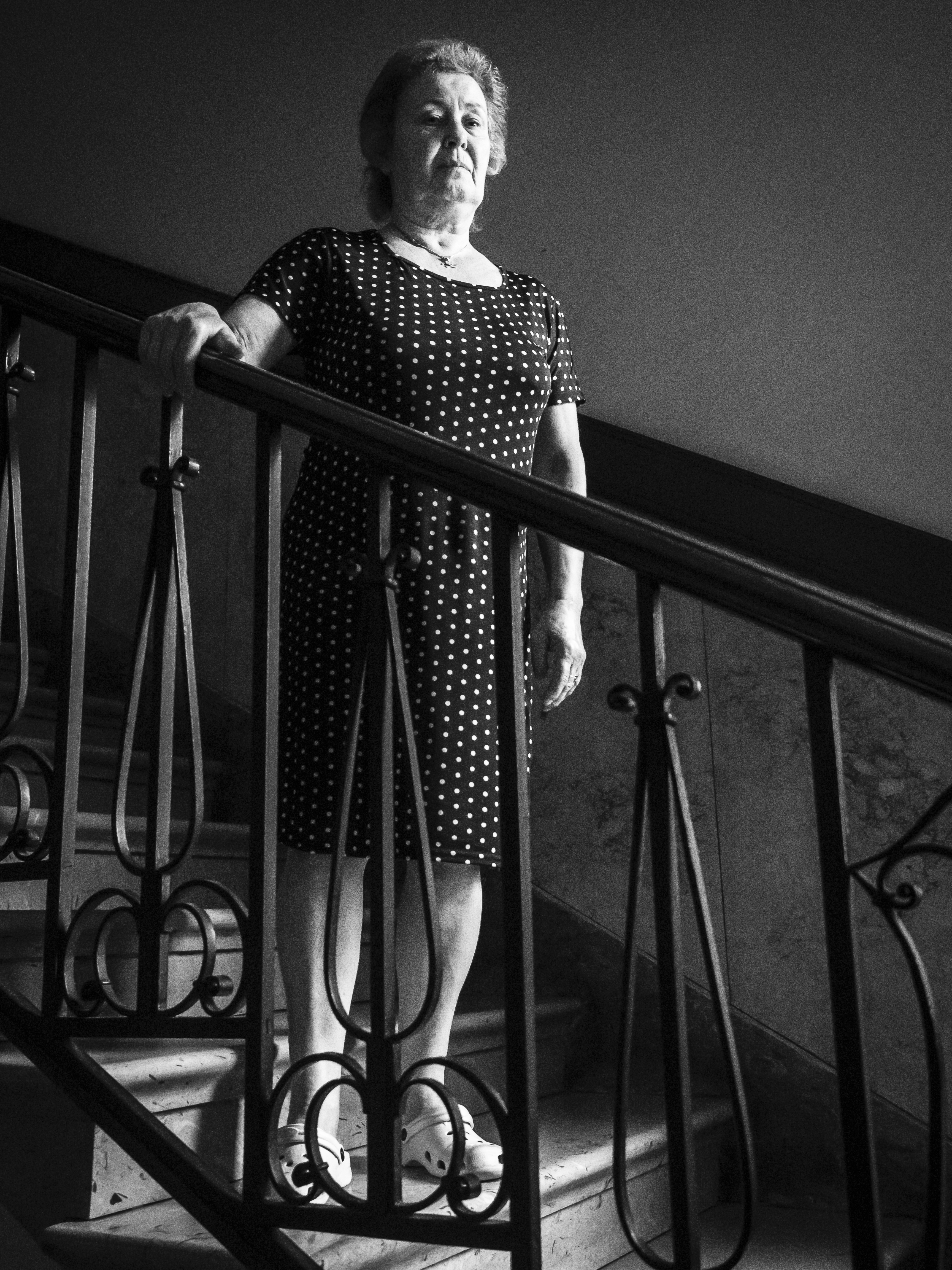 Osservo queste persone, sconosciute fino a ieri e ora, all’improvviso, una compagnia preziosa nei miei lunghi giorni di isolamento. È negli spazi comuni in cui ci incontriamo — scale e balconi — che compongo il mio diario per immagini. Scatto in bianco e nero perché l’assenza di colore accentua il ricordo di questa esperienza unica di “isolamento collettivo”.