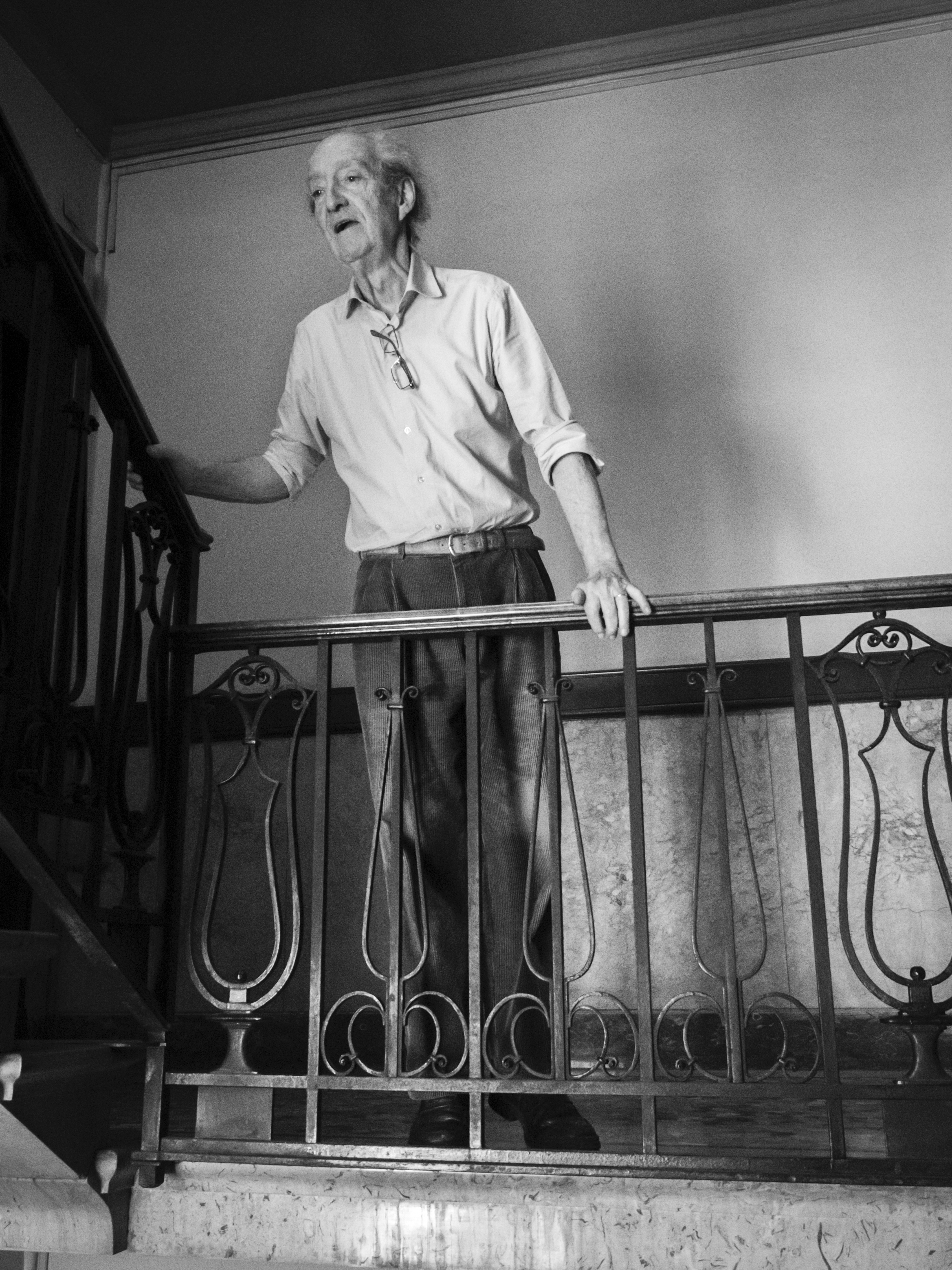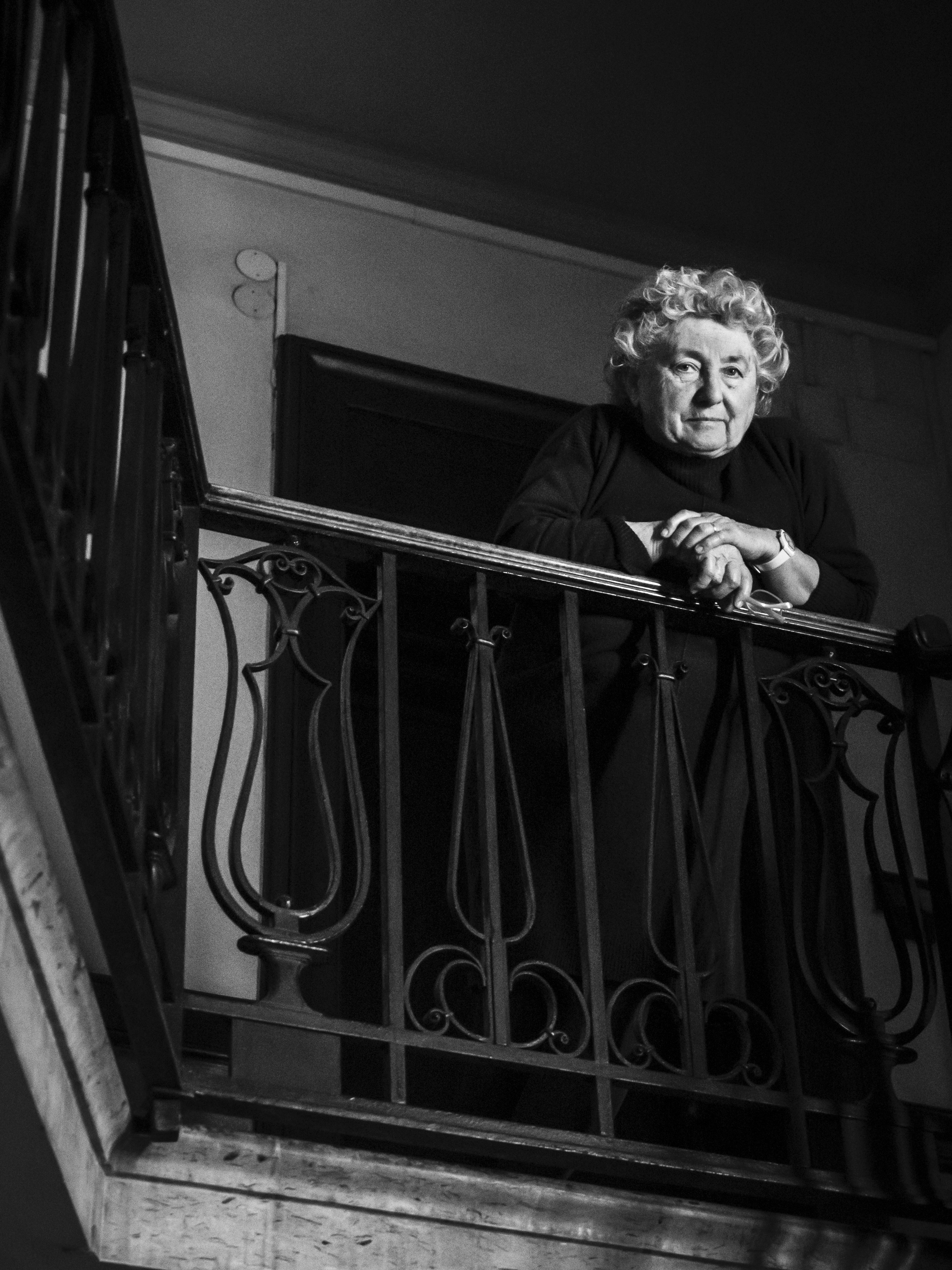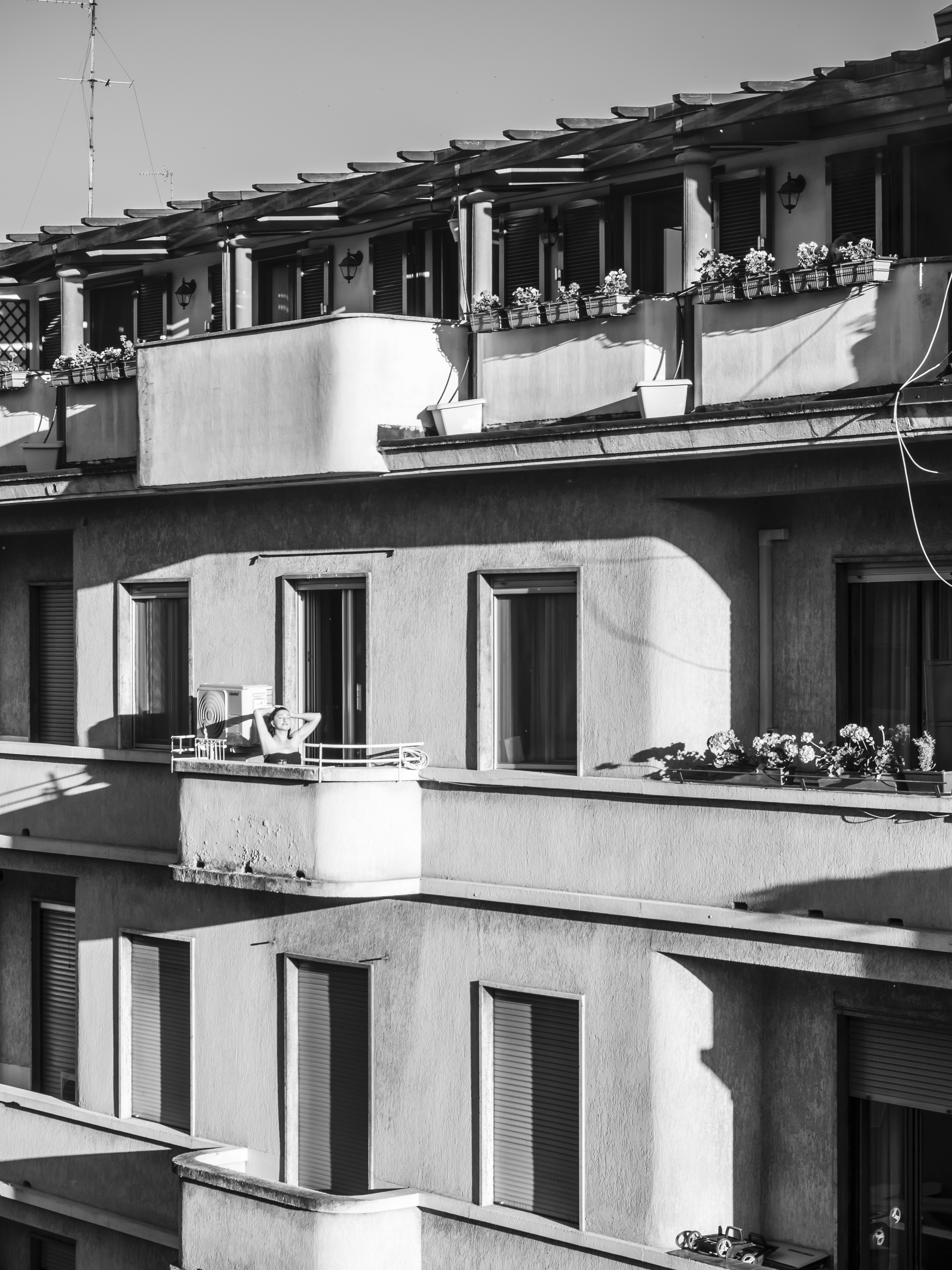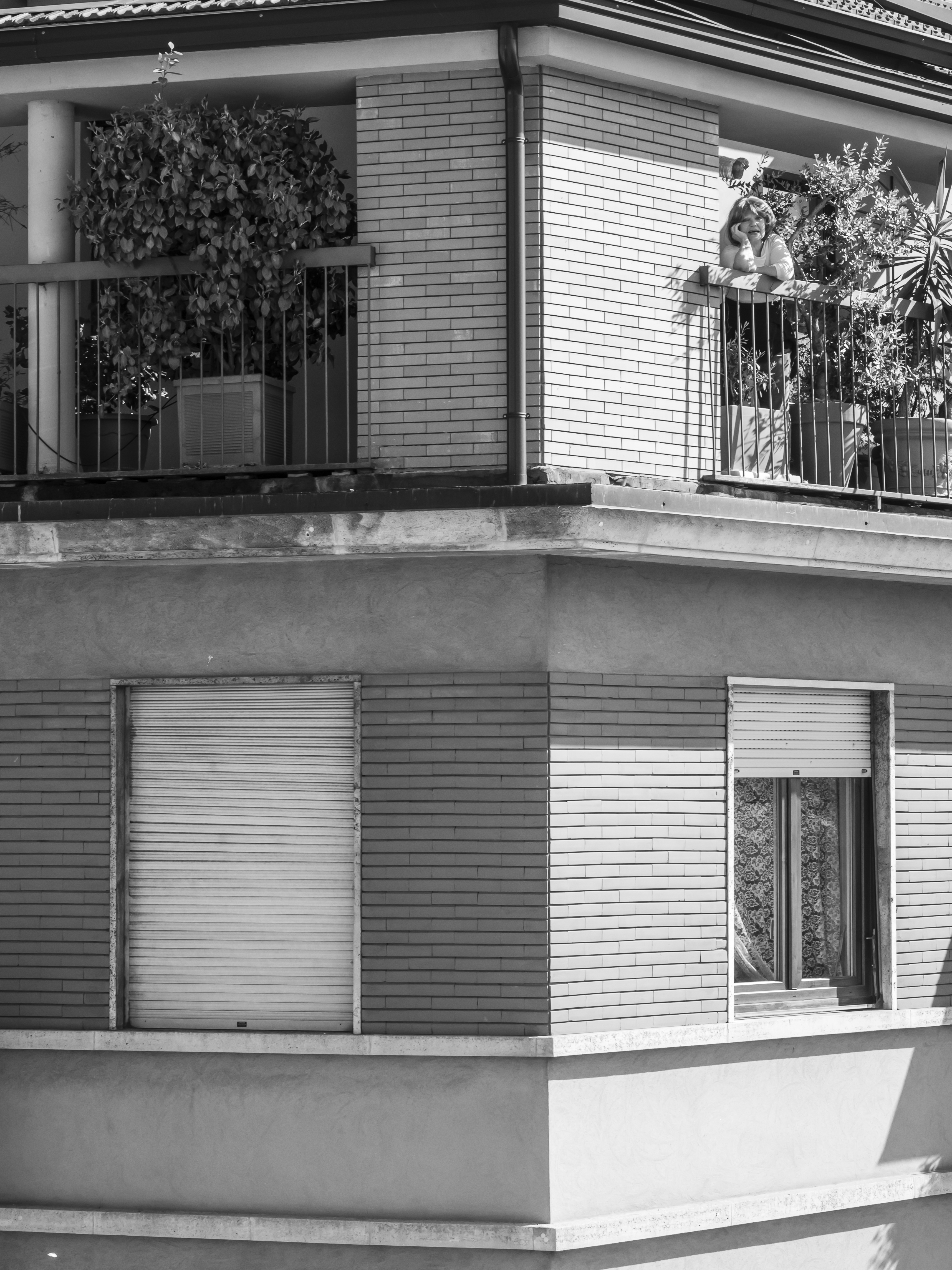 Osservo queste persone, sconosciute fino a ieri e ora, all’improvviso, una compagnia preziosa nei miei lunghi giorni di isolamento. È negli spazi comuni in cui ci incontriamo — scale e balconi — che compongo il mio diario per immagini. Scatto in bianco e nero perché l’assenza di colore accentua il ricordo di questa esperienza unica di “isolamento collettivo”.